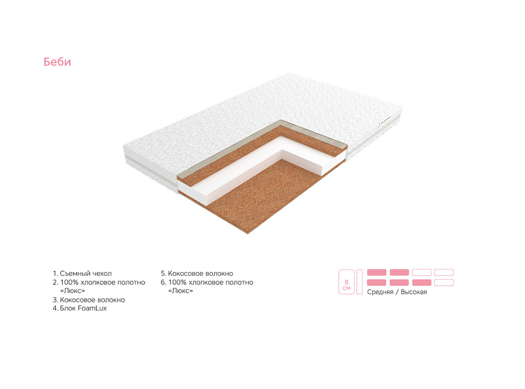 | Материал | Хлопковое полотно, Чехол, FoamLux, Кокосовое волокно |