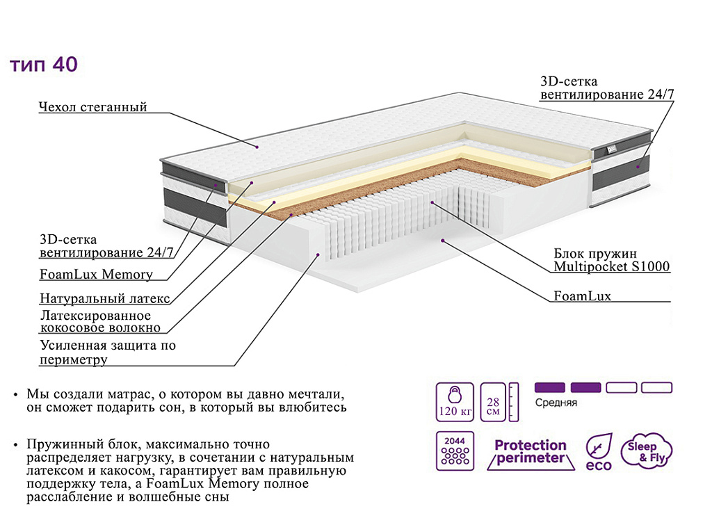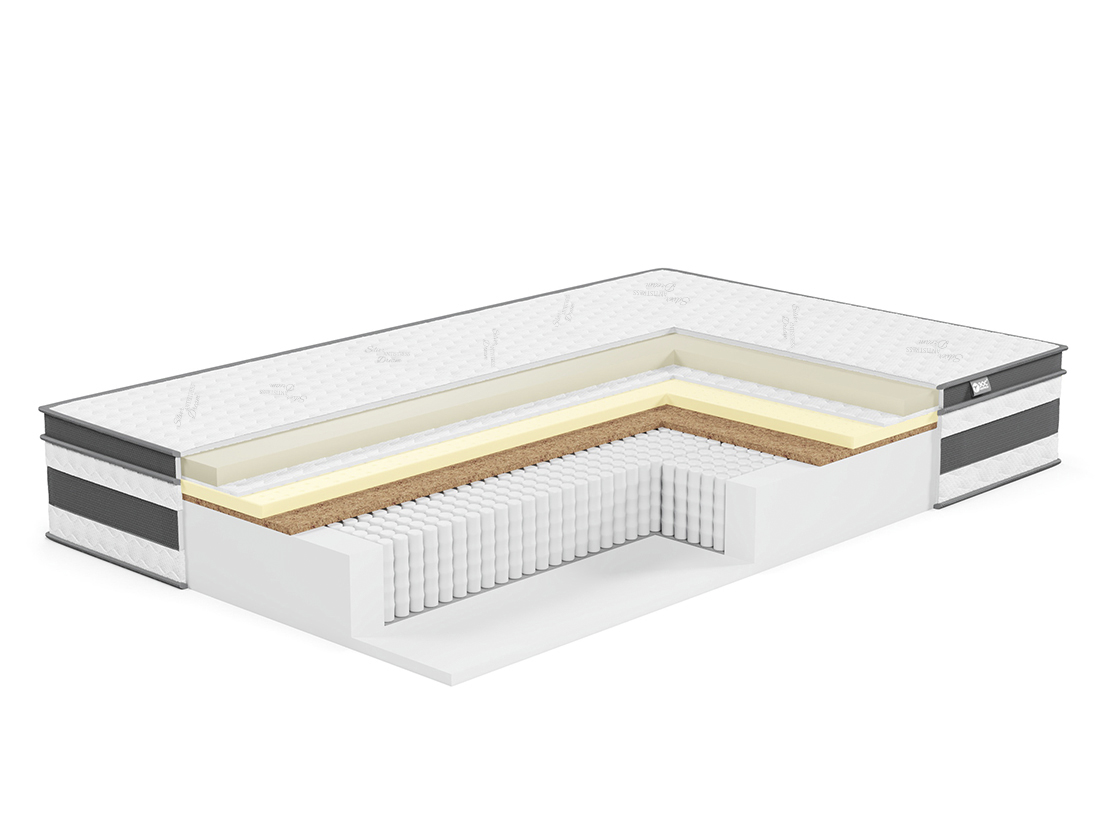 | Материал | Латекс, Блок независимых пружин, Чехол, Войлок, FoamLux, Латексированная кокосовая плита, Усиление по периметру матраса |