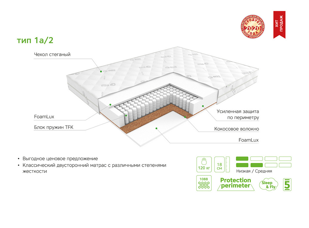 | Материал | Блок независимых пружин, Чехол, FoamLux, Кокосовое волокно, Усиление по периметру матраса |