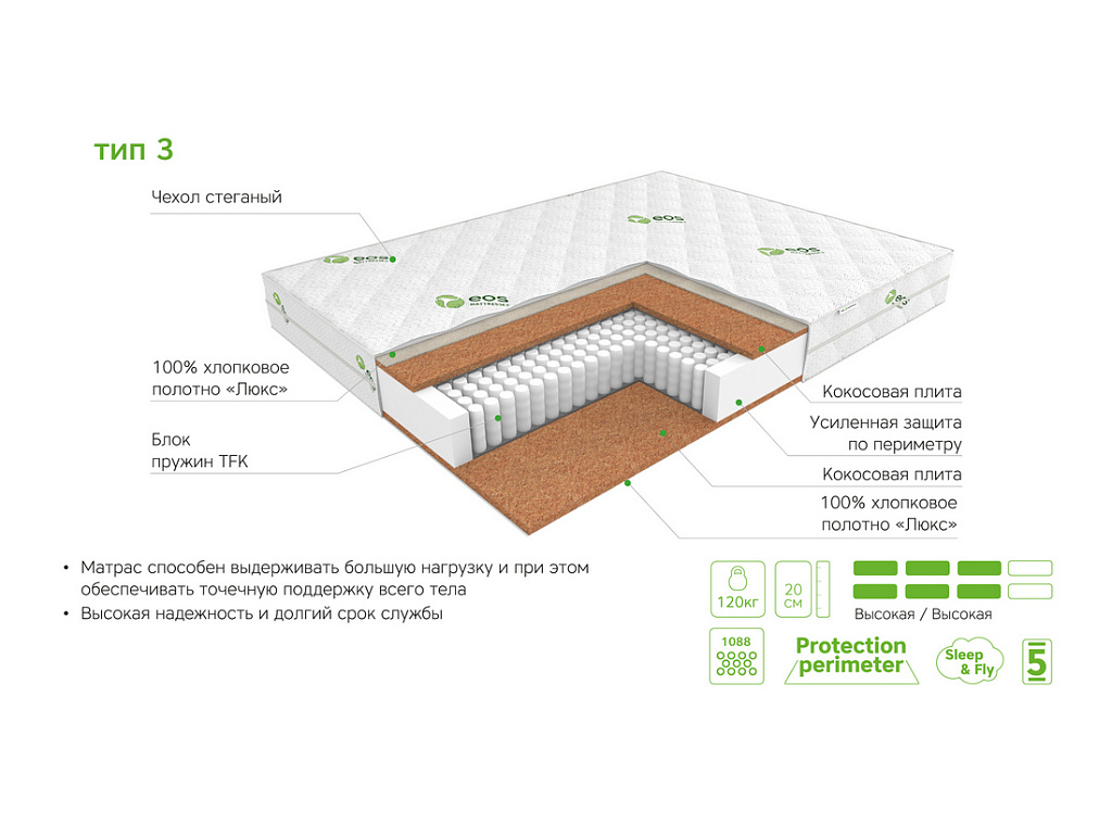 | Материал | Кокосовая койра, Блок независимых пружин, Хлопковое полотно, Чехол, Усиление по периметру матраса |