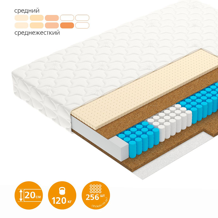 Оптимальное сочетание материалов и выверенный баланс жесткости делают эту модель самой популярной в коллекции. В основе кокосовая койра и упругий латекс для правильного положения тела во время сна.