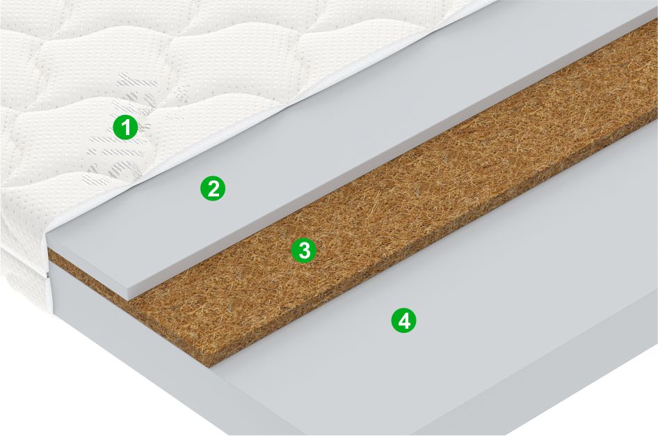 | Кокосовая койра | Натуральный материал из кокосовых волокон, спресованных в однородные плиты. Слой используется для придания матрасу дополнительной жесткости. |