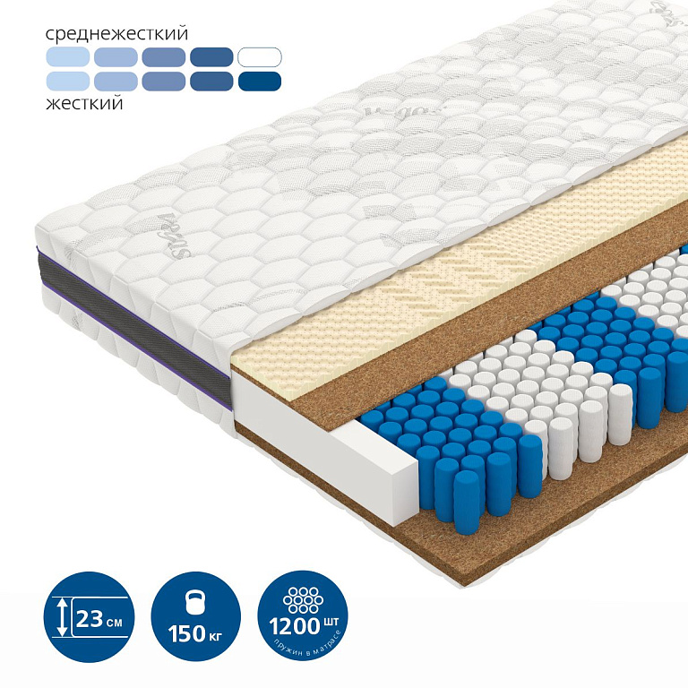 Оптимальное сочетание материалов и выверенный баланс жесткости делают эту модель самой популярной в коллекции. В основе – система Medizone, натуральные конопляные волокна, кокосовая койра и упругий латекс для правильного положения тела во время сна.