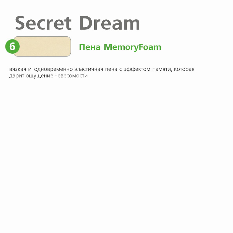 | MemoryFoam | Инновационный материал с памятью формы, используемый в космической промышленности. Обладает одновременно вязкостью и эластичностью, даря спящему ощущение невесомости. |