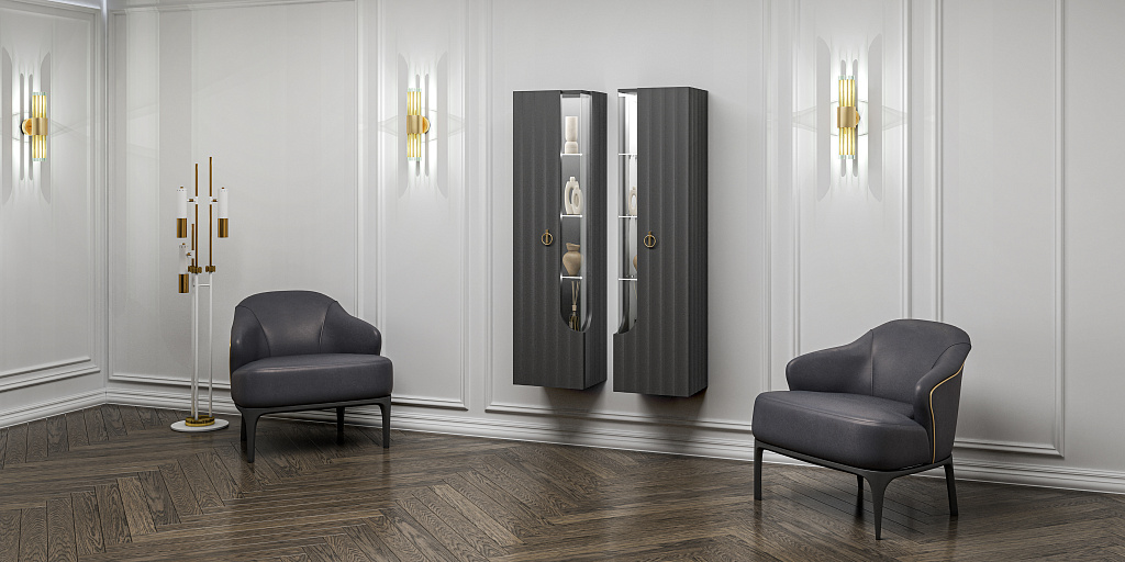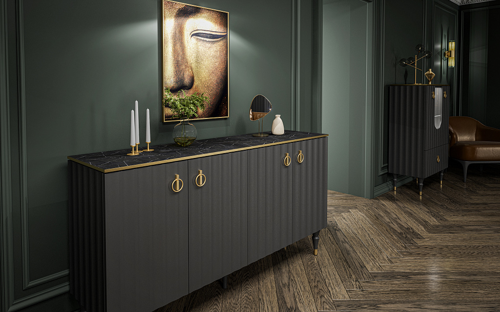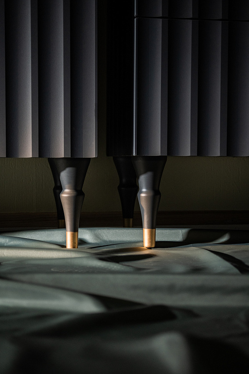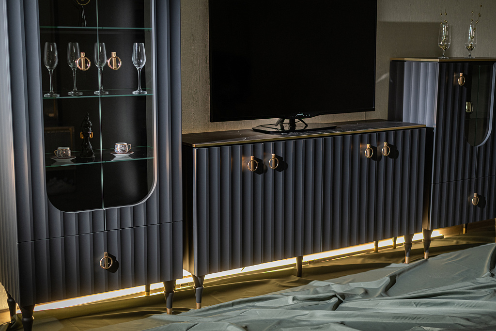 Дизайнерские резные ножки из дерева придают коллекции легкость, а инновационное матовое покрытие от итальянских производителей будто приглашает дотронуться до бархатистой волны фасада и ощутить тепло прикосновения.