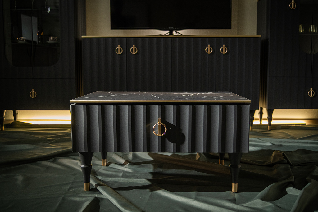 Изысканный дизайн, подчеркнутый золотой металлической линией на изящной столешнице Мрамор Неро Маркина.