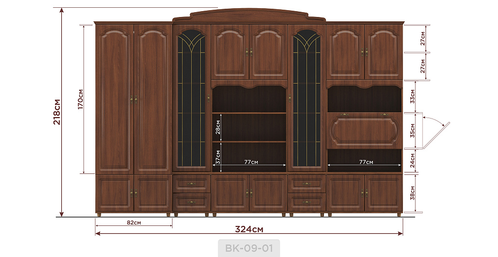 Гостиная выполнена в классическом стиле, которые из года в год остаются на пике мебельной моды и активности. Выглядят единой композицией, которая состоит из шкафов, витрин, комодов, полок, стеллажей.
