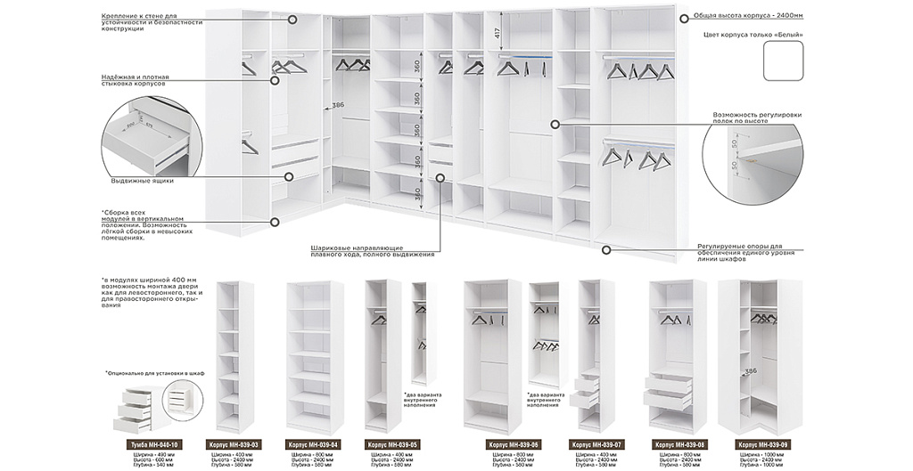 | Направляющие | Шариковые (телескопические) направляющие, Полного выдвижения, Скрытого монтажа, С доводчиками |