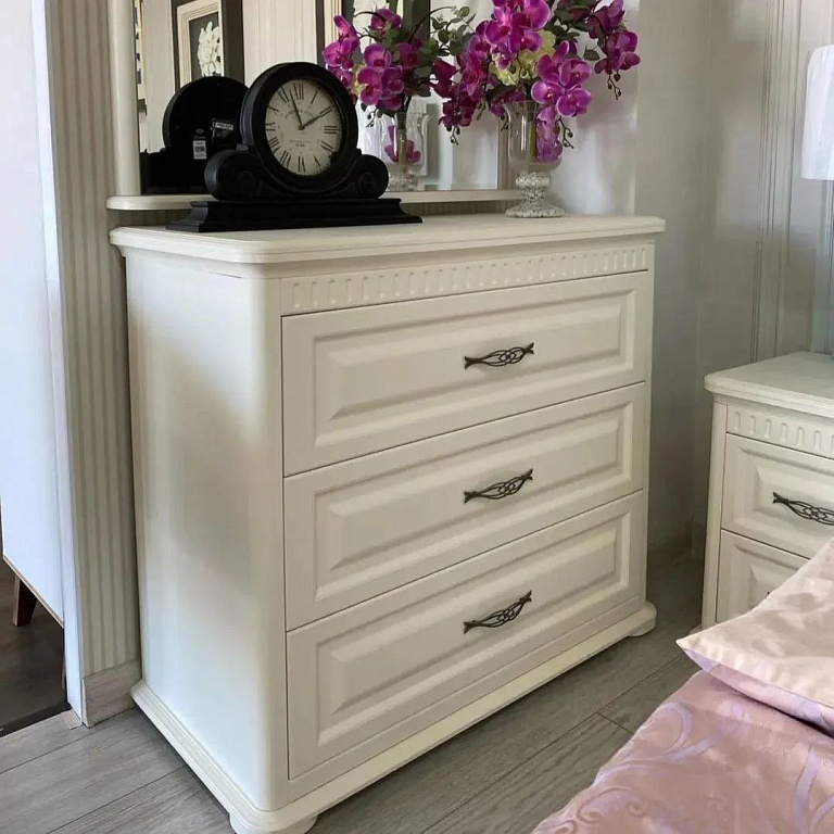 Плавное и бесшумное закрывание ящиков обеспечивают надёжные немецкие направляющие с доводчиком, а металлические ручки подчёркивают изысканность мебели. Спальня Марсель Крем — идеальное решение для тех, кто ценит комфорт и вечную классику.